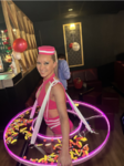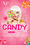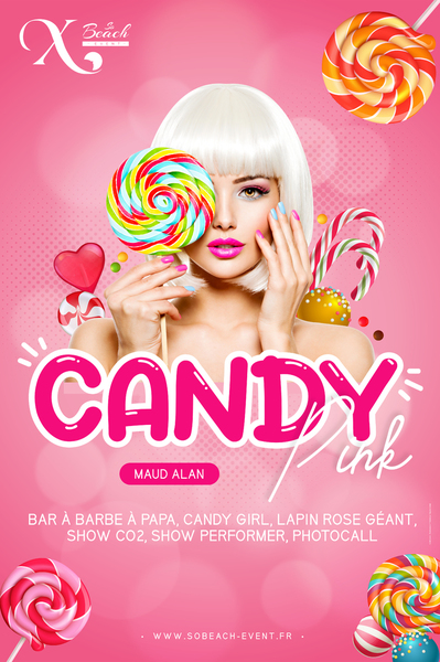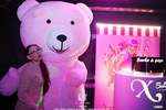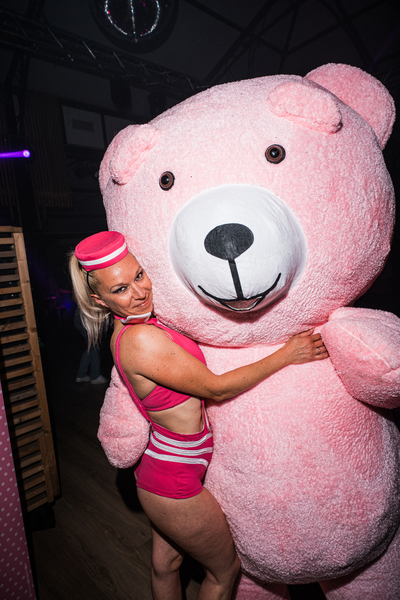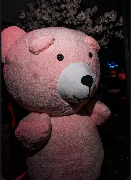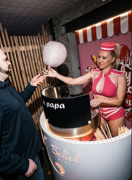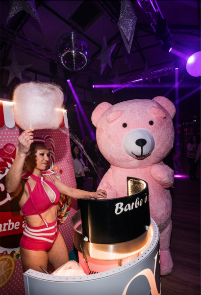 Accueil clients avec le bar à babrbe à papa, mascotte Ted rose Géant et la Candy Girl